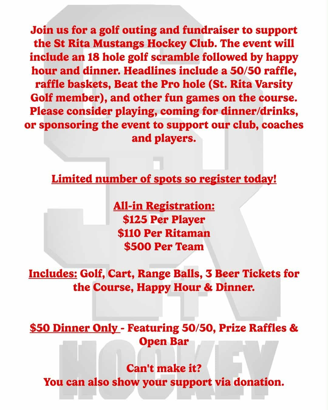 Join us for a golf outing and fundraiser to support the St Rita Mustangs Hockey Teams. The event will include an 18 hole golf scramble followed by happy hour and dinner. The day includes a 50/50 raffle, raffle baskets, Beat the Pro hole (St. Rita Varsity Golf member), and other fun games on the course. Please consider playing, coming for dinner/drinks, or sponsoring the event to support our club, coaches and players. Limited number of spots so register today!